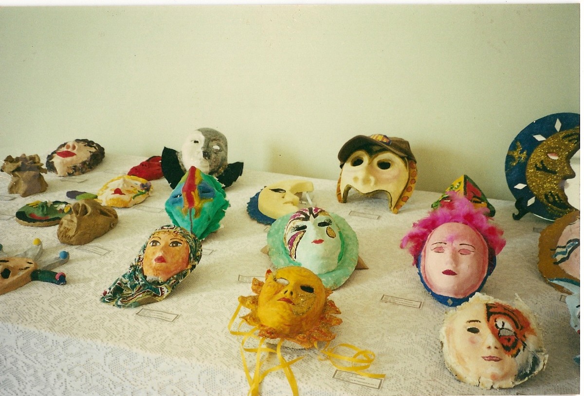 O molde do próprio rosto é tirado do rosto do aluno com gaze gessada. Esse molde, depois de seco, serve de forma para tirar a máscara. Nestas, utilizamos a papietagem. Depois de secas, foram lixadas, pintadas e decoradas.